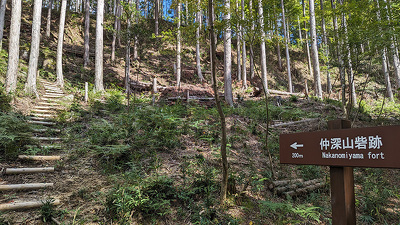 堀切を隔てた西側の曲輪は、周囲に帯曲輪を巡らせ、さらに 1 段低い位置に横堀・堀切とこれに連動する畝状竪堀群が巡る。このうち北西の 1 本は、万ヶ洞の入口を画するように麓近くまで延びる長大な竪堀である。仲深山砦の規模は、 明知城の主郭部分に匹敵し、一段低い位置に帯曲輪や横堀と連動した畝状竪堀群を設ける点も明知城に類似する。